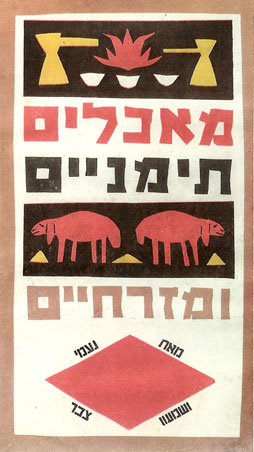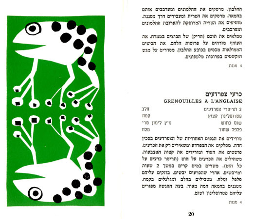 The book on French cooking is a selection of classical recipes from the French cuisine. The bibliography of the authors’ sources (books dated from 1370 to the 1961edition of Larousse Gastronomique) is listed at the end of the book. Presumably, Rene Mokadi provided the French-language expertise, but the book also required much linguistic research to find the Hebrew equivalents for the ingredients required in French cooking. Some of the words were provided by the Academy of Hebrew Language, but others had to be newly invented. Shimon prided himself on introducing the Hebrew for lobster (akravtan) and langouste (tzavtan) into the Hebrew dictionary. The book contains a list of the Hebrew equivalents of unfamiliar terms, and the names of specific meat cuts, printed on a picture of the body of a cow. The most striking feature of the book, at the time was that the recipes did not follow the rules of kosher cooking. This was revolutionary in Israel at the time. Even today mainstream cookery books published in Israel remain firmly kosher.